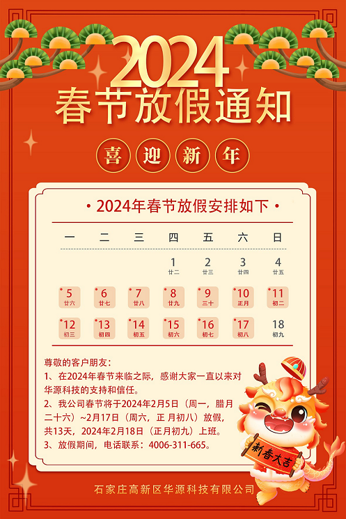 石家莊高新區(qū)華源科技春節(jié)放假通知,公司是石家莊專業(yè)的太陽能、空氣能熱泵服務商,擁有豐富的行業(yè)經驗、專業(yè)的技術服務,熱水洗浴、制冷、采暖系統(tǒng)咨詢定制電話:4006-311-665,華源科技祝大家新年快樂,龍年吉祥!